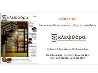 Το περιοδικό ΚΛΕΨΥΔΡΑ παρουσιάστηκε επίσημα για πρώτη φορά στο βιβλιοκαφέ ΕΝΑΣΤΡΟΝ, Σόλωνος 101 Αθήνα, στις 3 Δεκεμβρίου και ώρα 8.οο. Την ίδια μέρα, μαζί με το περιοδικό έγινε η πρώτη μιας σειράς εκδηλώσεων που διοργάνωσε η Λέσχη Πολιτισμού ΕΝΑΣΤΡΟΝ, ένα αφιέρωμα στον Οδυσσέα Ελύτη και στην ποίηση.